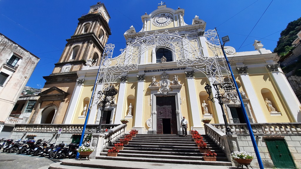 Appena si arriva nella piazza Umberto I si incontra la Chiesa di San Salvatore de’ Birecto, dove al tempo della Repubblica di Amalfi venivano incoronati i duchi. Guardando verso l’alto invece si intravede la bianca Collegiata di Santa Maria Penitente con il campanile di mattonelle di maiolica.