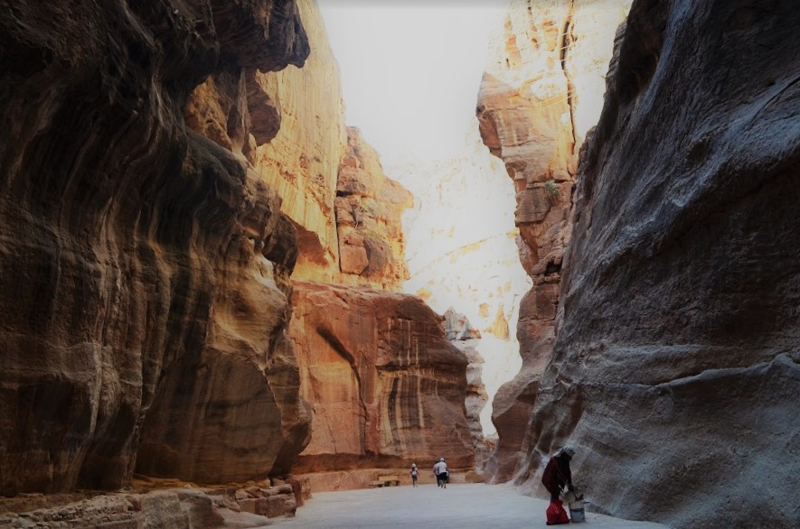 Dall’ingresso, attraversando il Siq, un suggestivo canyon che si snoda tra rocce altissime levigate dall’acqua piovana, dopo circa 2 chilometri, da percorrere esclusivamente a piedi o con l’ausilio di macchine elettriche, di dromedari o asini, si raggiunge il Tesoro o Al Khazna il punto più celebre e conosciuto di tutto il Parco.