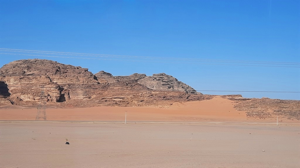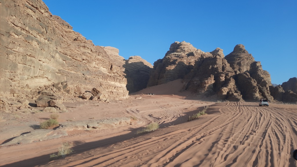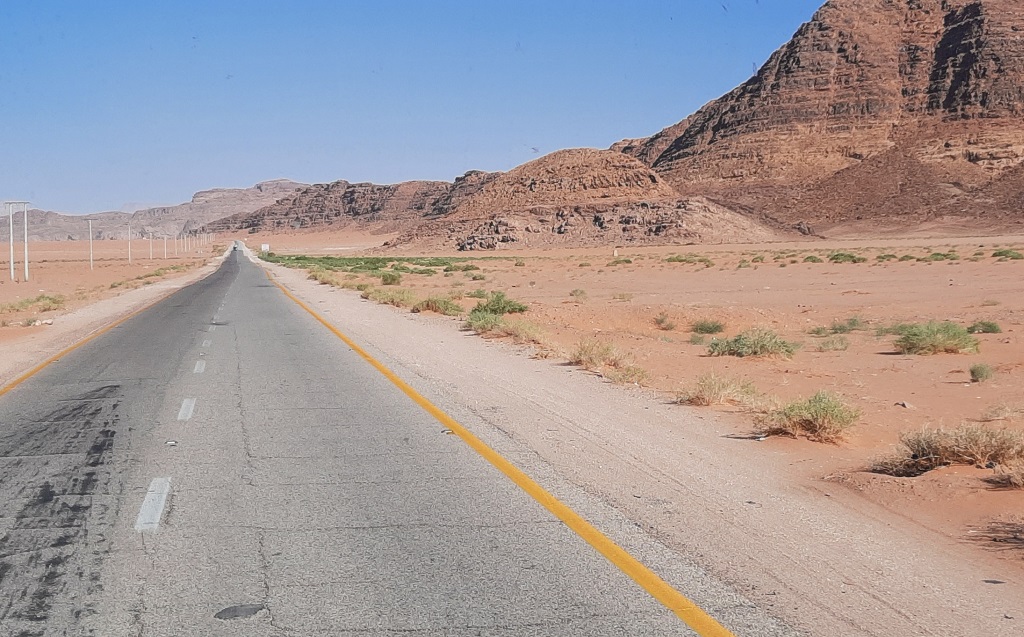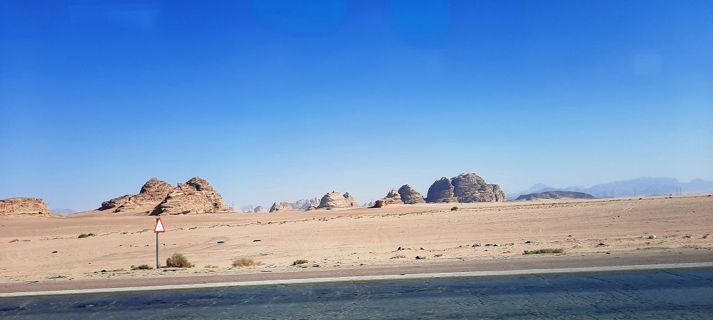Caricati i bagagli sul bus ci siamo messi subito in viaggio e abbiamo percorso la strada n. 45 detta anche l’autostrada del Deserto (Desert Hwy) raggiungendo la prima meta, il deserto del Wadi Rum, il luogo più a sud della Giordania.