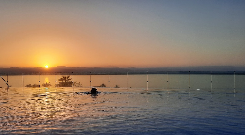 – Tramonto pazzesco sul Mar Morto immersi in una piscina a sbalzo (anche se c’era il vetro!)