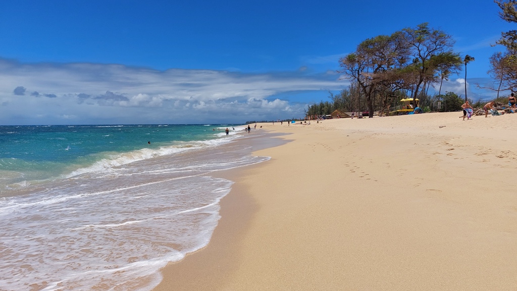 Dopo la levataccia del mattino, il pomeriggio ce lo siamo preso di relax. Abbiamo trascorso alcune ore a Baldwin Beach Park, una spiaggia di sabbia bianca fine con un mare meravigliosamente azzurro. Peccato solo il vento che ha disturbato la nostra permanenza in spiaggia.