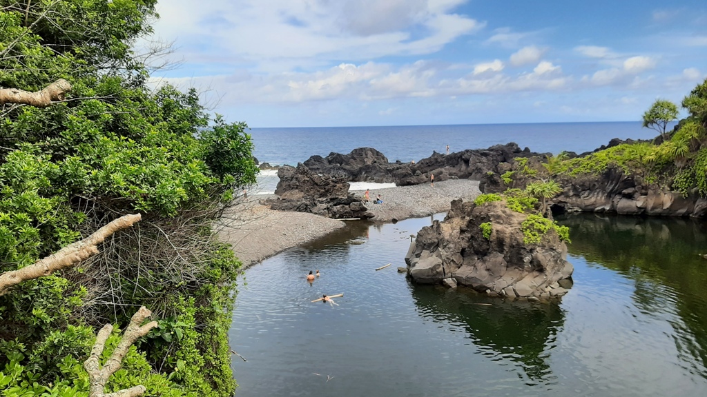 Subito dopo Hana abbiamo fatto una sosta a Waioka Pond, noto anche come Venus Pools, piscine naturali che sorgono proprio accanto all’oceano circondate da alte scogliere dalle quali le persone si tuffano in acqua. Anche qui è presente una bella spiaggia con la sabbia nera.