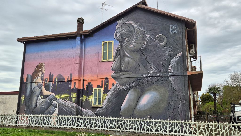 Descrizione del murales: un’opera incredibile, per noi forse la più bella. Il gorilla tiene sul palmo Dwan, la protagonista femminile; in questo gesto  l’autore è riuscito a mostrare un’incredibile dolcezza  nello sguardo dei due protagonisti.