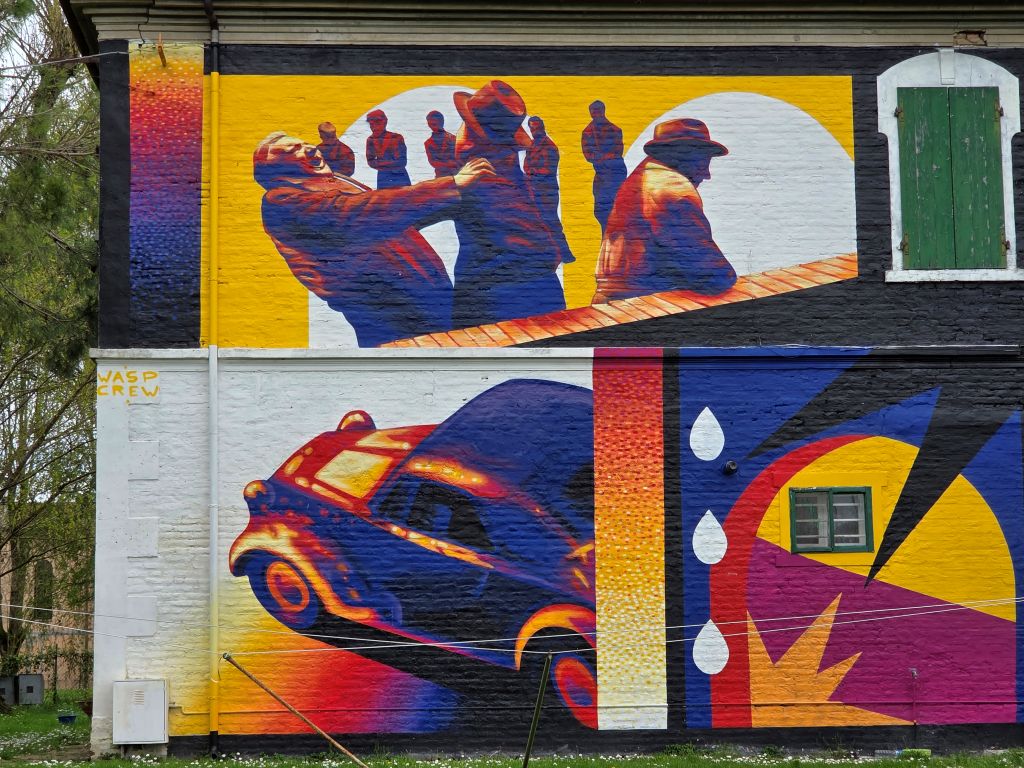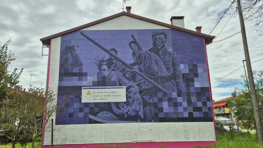 Descrizione del murales: Il murales rappresenta un omaggio al film di Roberto Rossellini che racconta la Resistenza italiana durante la Seconda Guerra Mondiale. Nella scena, dipinta con tonalità blu e viola, si vede un americano, dei partigiani e il popolo delle Valli del Delta del Po, uniti su delle barche, simbolo di solidarietà e resistenza contro il potere nazista. All’interno dell’opera è stata inclusa una citazione di Alberto Moravia, “Le amicizie non si scelgono a caso, ma secondo le passioni che ci dominano”, ricorda come le lotte guidate da ideali comuni, possono unire le persone, superando le barriere e le differenze.