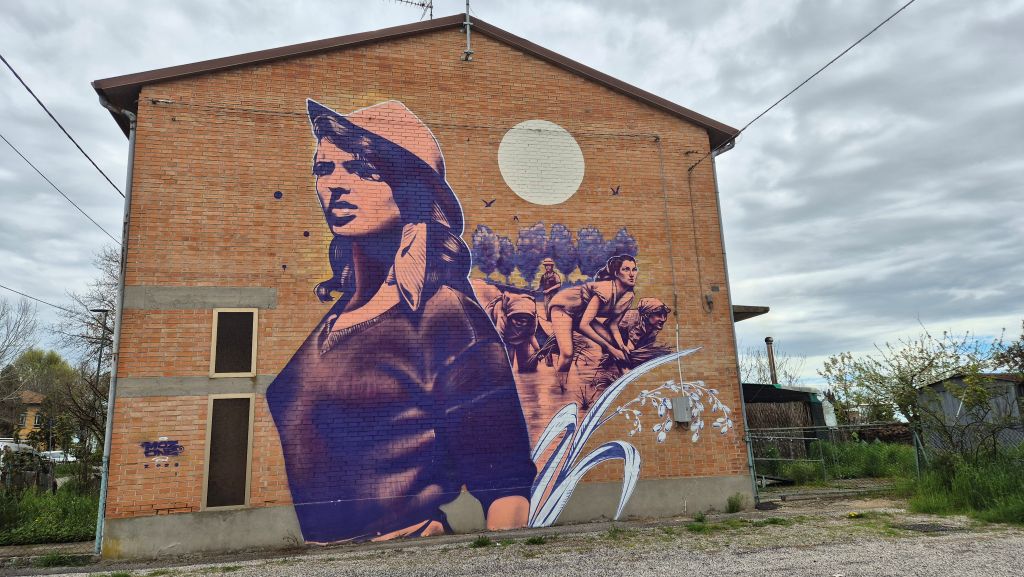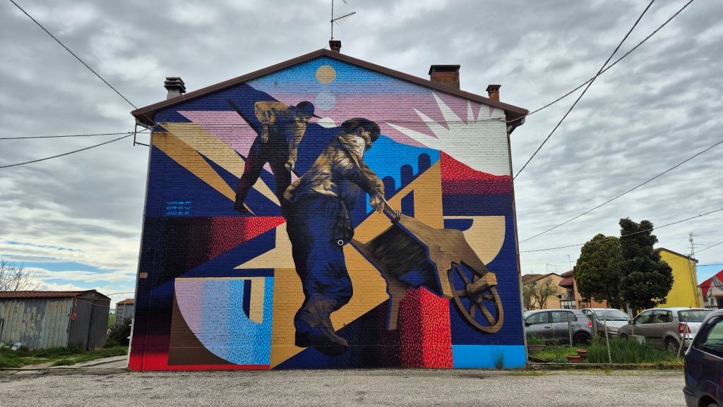 Descrizione del murales: L’artista ha scelto questo lungometraggio per il forte legame con il territorio ferrarese e le sue campagne dove il film è ambientato. Nella scena sono rappresentati due scariolanti al lavoro; dietro di loro il paesaggio rurale, con le colline che si trasformano nelle tipiche arcate che ricordano i portici delle città emiliane. Il ritmo di lavoro è rappresentato dalle fasi lunari nel cielo e simboleggiano il tempo che passa.