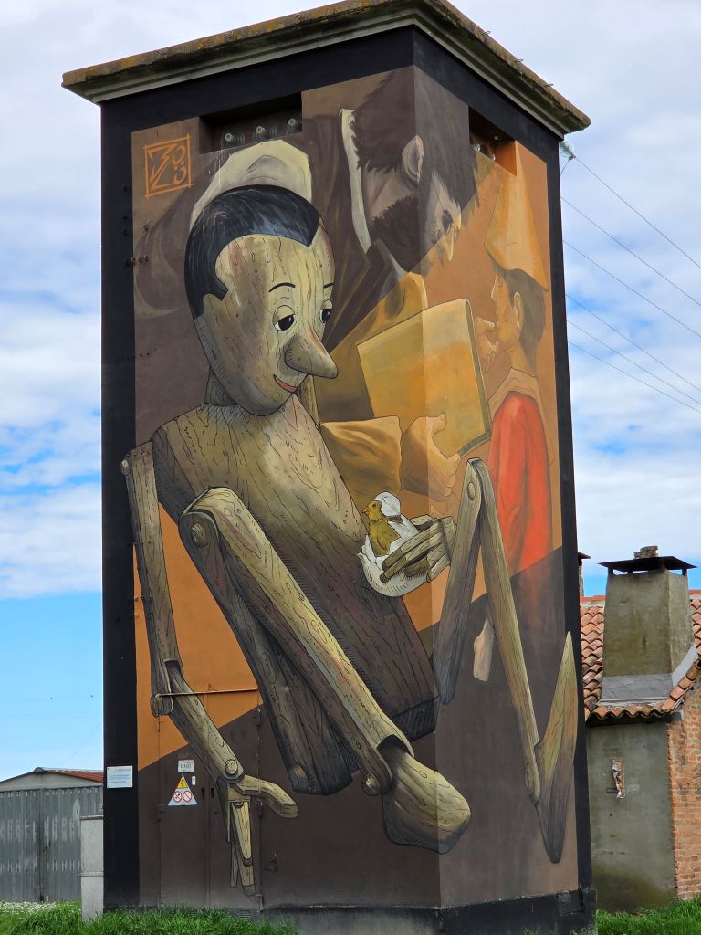 Descrizione murales: l’opera è un omaggio al maestro degli effetti speciali, Carlo Rambaldi, che ha realizzato il prototipo del burattino di Collodi utilizzato nel film “Le avventure di Pinocchio”.