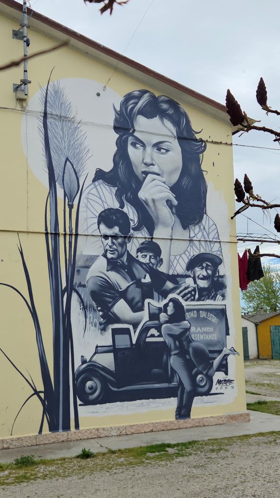 Descrizione del murales: sul muro è ritratta la protagonista del fim, Silvana Mangano, coinvolta in una storia drammatica, fatta di intrighi e segreti della campagna del dopo guerra.