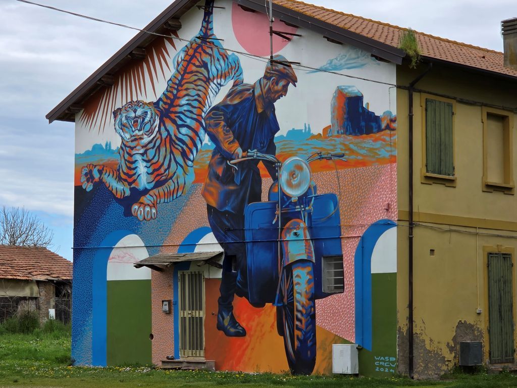 Descrizione del murales: Il murales si ispira al film “Volevo nascondermi”, che narra la vita del pittore Antonio Ligabue. La scena raffigurata nel murales riprende un momento in cui Ligabue esprime il desiderio di libertà. La tigre simboleggia la lotta e il coraggio, la motocicletta potrebbe essere un richiamo al viaggio, alla libertà ed al desiderio di fuga.